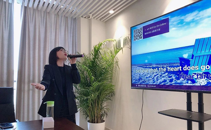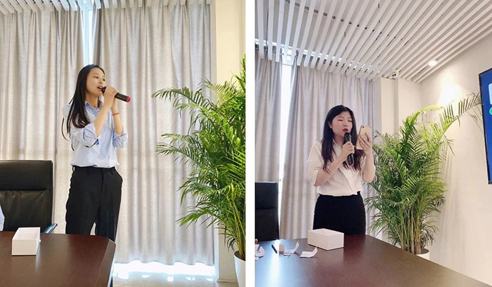伴隨著現場緩緩奏起的輕音樂,主持人Sandy在進行自我介紹和現場預熱后,以抽簽形式開始了歌曲競唱環節,國際市場部的Sabrina自告奮勇獻唱曲,熱情演唱了經典英文歌曲——《 Trouble is a friend 》,贏得現場陣陣掌聲!