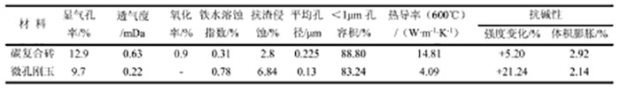 陶瓷杯熱導率較小,熱阻大,使得爐缸部位的冷卻系統難以發揮作用。并且陶瓷杯只能延緩侵蝕進度,陶瓷杯抗爐渣侵蝕性能較差,待陶瓷杯被侵蝕殆盡之后,依然會造成炭磚直接接觸鐵水。因此,研究人員將Al?O?和碳進行優化復合,試制了碳復合磚,其600℃熱導率約14.81 W·m-1·K-1,雖然略低于部分炭磚的熱導率,但是與剛玉質材料的熱導率4.09/5.42 W·m-1·K-1相比有很大提高,同時保持了陶瓷材料的優良抗侵蝕性,具體性能見表4??稍阼F水與磚接觸面形成保護層,即使保護層脫落,也具有足夠的抗鐵水侵蝕性,保護爐缸部位的安全。碳復合磚兼顧了炭磚和陶瓷杯的優勢,實現“自保護”和“他保護”結合,是新一代爐缸爐底耐火材料的發展方向之一。