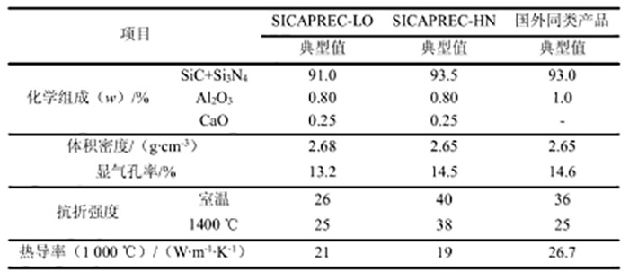 此外,中鋼洛耐院還開發出可替代定形制品的碳化硅質預制大塊(SICAPREC),其性能見表6。可以看出,所開發預制塊雜質含量低、化學純度較高,SiC和Si?N?合量達到了90%以上,體積密度不低于2.65 g·cm-3,氣孔率不超過15%,具有優異的常溫和高溫抗折強度,以及良好的導熱系數。與牌號SICAPREC-LO相比較,牌號SICAPREC-HN碳化硅質預制塊力學性能更加優異,但其導熱系數略低。除導熱系數外,牌號SICAPREC-HN碳化硅質預制塊的各項指標均超過文獻所報道國外同類產品。