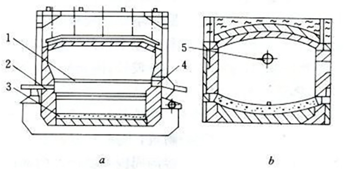 圖2:反射爐斷面結(jié)構(gòu)示意圖 (a-吊頂式;b-拱頂式)