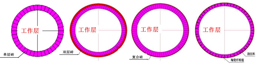 耐火磚掉磚、抽簽等問題。對于危廢回轉窯系統而言,由于轉速比較慢,一般在1轉/分以下,可以根據廠房設計和節能要求選擇單層磚、雙層磚、復合磚和整體澆注等不同結構,如圖3所示。回轉窯耐火材料總厚度一般是250-300mm不等,其中工作層