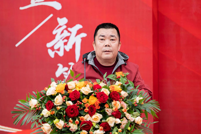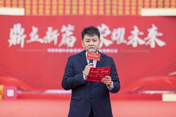 zui后,在熱情洋溢的現場氛圍中,河南榮盛科技集團董事長楚科奇發布了致辭。他首先代表集團向蒞臨現場的各位領導、嘉賓及全體員工表示熱烈歡迎與誠摯感謝。楚總回顧了集團十二年的發展歷程,指出新材料生產基地的建成,凝聚了全體榮盛人的智慧、汗水與堅守,是企業十二年奮斗征程上的重要里程碑,更是企業面向未來、決勝未來的戰略新起點。楚總強調,新工廠的順利落成,得益于各級主管部門的大力支持與高效服務,也離不開集團管理層的高效協同與一線團隊的奮力拼搏。他特別感謝了王海軍總經理及集團管理層,稱贊其在項目戰略定位與資源配置中發揮的關鍵作用;同時,他也向宋廣林總經理及全體建設者致敬,感謝他們不畏艱辛、全力以赴,將一片荒蕪之地打造為現代化智能工廠。