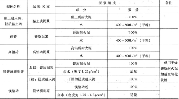 在砌筑高鋁磚時,應(yīng)用高鋁質(zhì)耐火泥。砌筑含Al2O360%~70%的高鋁磚時,采用的耐火泥由75%~85%的燒礬土和10%~20%的生粘土組成;砌筑含A12O348%~55%的高鋁磚時,也可采用高耐火度的粘土質(zhì)耐火泥。