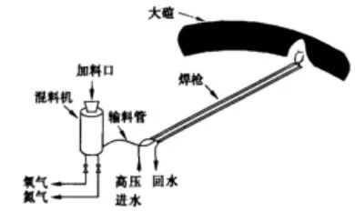 焊補設備主要由焊槍、混料機、操作控制盤、冷卻水加壓泵、高壓橡膠管組成。輔助設備有:均料機、耐材切割鋸、小型液壓站、冷卻設備等。工作條件要求:0.4MPa以上的純氧,0.02MPa的氮氣,1MPa的水壓。焊補工作示意圖見圖1。